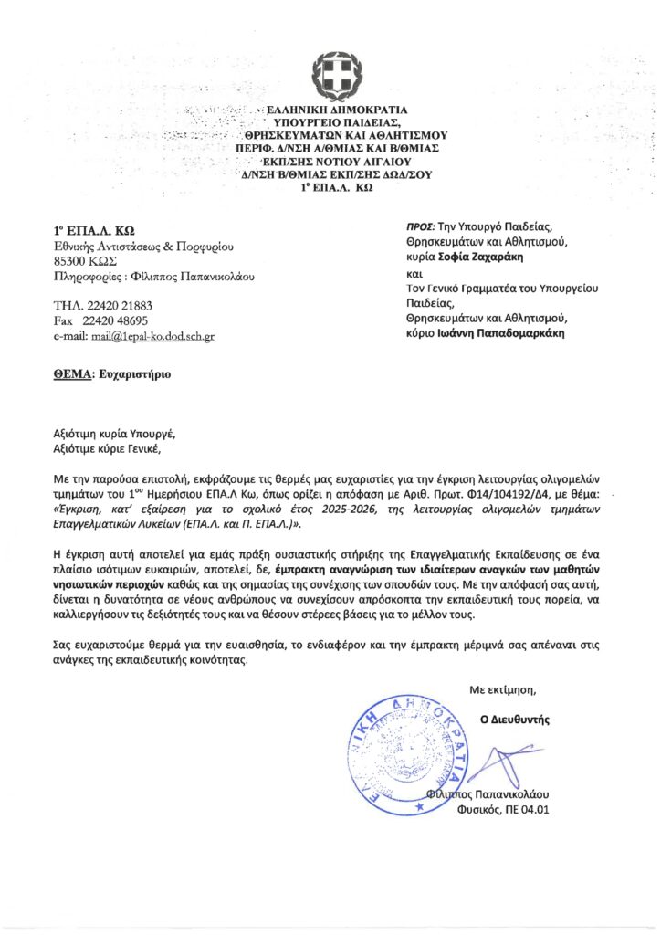 Ευχαριστήριο του 1ου ΕΠΑΛ Κω προς το Υπουργείο Παιδείας για την έγκριση ολιγομελών τμημάτων