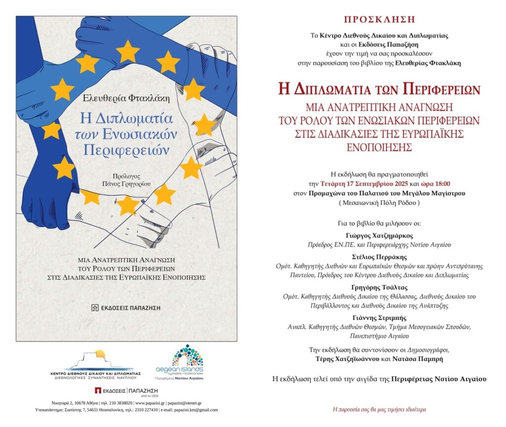 Παρουσίαση του νέου βιβλίου της Ελευθερίας Φτακλάκη Τετάρτη 17 Σεπτεμβρίου στη Ρόδο Το Κέντρο Διεθνούς Δικαίου και Διπλωματίας και οι Εκδόσεις Παπαζήση παρουσιάζουν το βιβλίο της Ελευθερίας Φτακλάκη «Η Διπλωματία των Ενωσιακών Περιφερειών: Μια ανατρεπτική ανάγνωση του ρόλου των Ενωσιακών Περιφερειών στις διαδικασίες της ευρωπαϊκής ενοποίησης» Η εκδήλωση θα πραγματοποιηθεί την Τετάρτη, 17 Σεπτεμβρίου 2025, […]