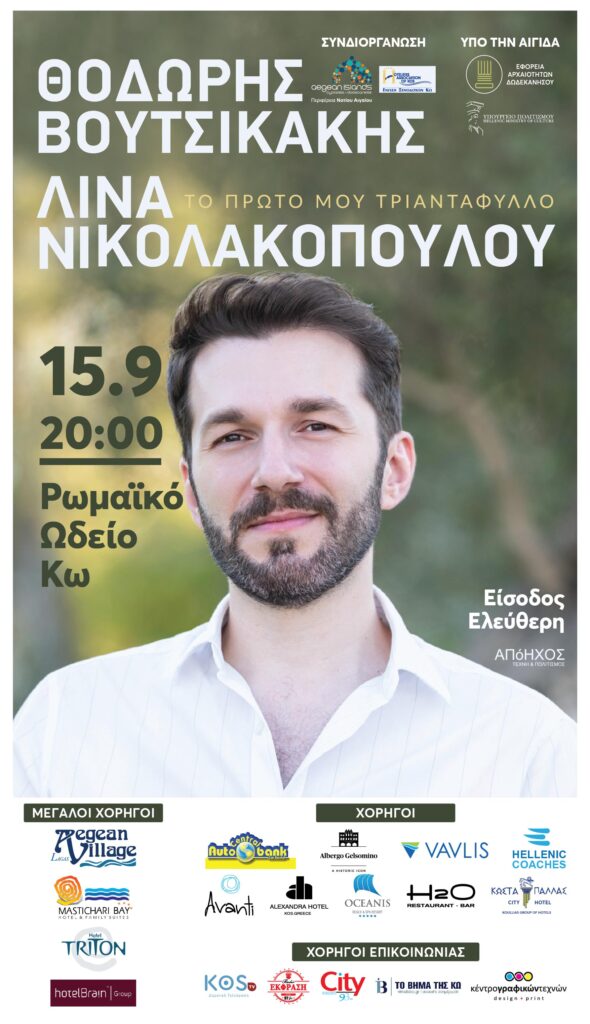 Η Περιφέρεια Νοτίου Αιγαίου διοργανώνει τη συναυλία «Το Πρώτο Μου Τριαντάφυλλο» ΗΠεριφέρεια Νοτίου Αιγαίου- το Επαρχείο Κω Νισύρου , σε συνεργασία με την Ένωση Ξενοδόχων Κω και υπό την αιγίδα της Εφορείας Αρχαιοτήτων Δωδεκανήσου , διοργανώνουν τη μοναδική συναυλία «Το Πρώτο Μου Τριαντάφυλλο» με τον σπουδαίο ερμηνευτή Θοδωρή Βουτσικάκη και την κορυφαία στιχουργό Λίνα Νικολακοπούλου. […]