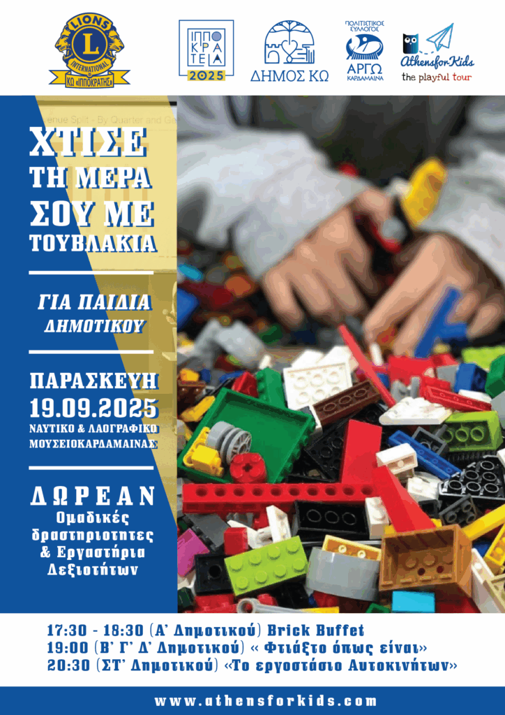 ΕΚΠΑΙΔΕΥΤΙΚΗ ΔΡΑΣΗ ΓΙΑ ΠΑΙΔΙΑ, σε συνεργασία με τη ΛΕΣΧΗ LIONS ΚΩ «Ο ΙΠΠΟΚΡΑΤΗΣ» Στο πλαίσιο των θερινών πολιτιστικών εκδηλώσεων «Ιπποκράτεια 2025» το Τμήμα Πολιτισμού Δήμου Κω σας ενημερώνει για τις προσεχείς εκδηλώσεις: ΠΑΡΑΣΚΕΥΗ 19/09/25 ΕΚΠΑΙΔΕΥΤΙΚΗ ΔΡΑΣΗ ΓΙΑ ΠΑΙΔΙΑ, σε συνεργασία με τη ΛΕΣΧΗ LIONS ΚΩ «Ο ΙΠΠΟΚΡΑΤΗΣ» ΝΑΥΤΙΚΟ & ΛΑΟΓΡΑΦΙΚΟ ΜΟΥΣΕΙΟ ΚΑΡΔΑΜΑΙΝΑΣ, ΩΡΑ ΕΝΑΡΞΗΣ: […]