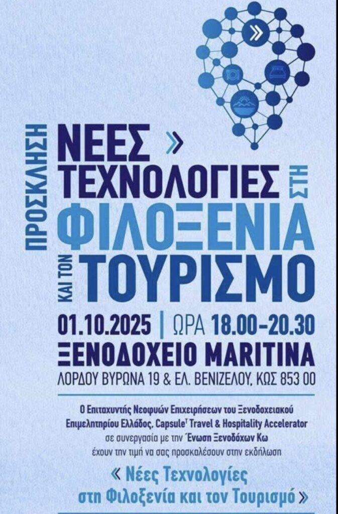 Ένωση Ξενοδόχων Κω: “Νέες Τεχνολογίες στη Φιλοξενία και τον Τουρισμό”, την Τετάρτη 1 Οκτωβρίου στις 18:00 στο ξενοδοχείο MARITINA