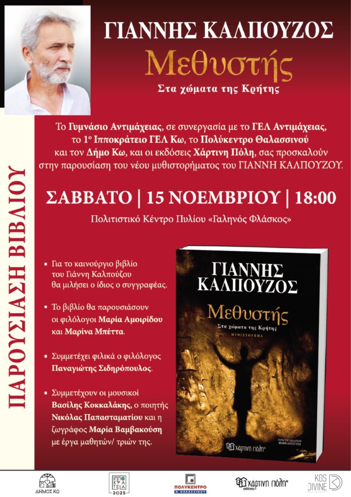 Παρουσίαση του βιβλίου «Μεθύστης. Στα χώματα της Κρήτης» του Γιάννη Καλπούζου | Ιπποκράτεια 2025 Στο πλαίσιο των Πολιτιστικών Εκδηλώσεων «Ιπποκράτεια 2025» το Τμήμα Πολιτισμού Δήμου Κω σας ενημερώνει: ΣΑΒΒΑΤΟ 15/11/25 ΠΑΡΟΥΣΙΑΣΗ ΤΟΥ ΒΙΒΛΙΟΥ του συγγραφέα ΓΙΑΝΝΗ ΚΑΛΠΟΥΖΟΥ με τίτλο: «ΜΕΘΥΣΤΗΣ. ΣΤΑ ΧΩΜΑΤΑ ΤΗΣ ΚΡΗΤΗΣ» σε συνεργασία με το ΓΥΜΝΑΣΙΟ ΑΝΤΙΜΑΧΕΙΑΣ, το ΓΕΛ ΑΝΤΙΜΑΧΕΙΑΣ, […]