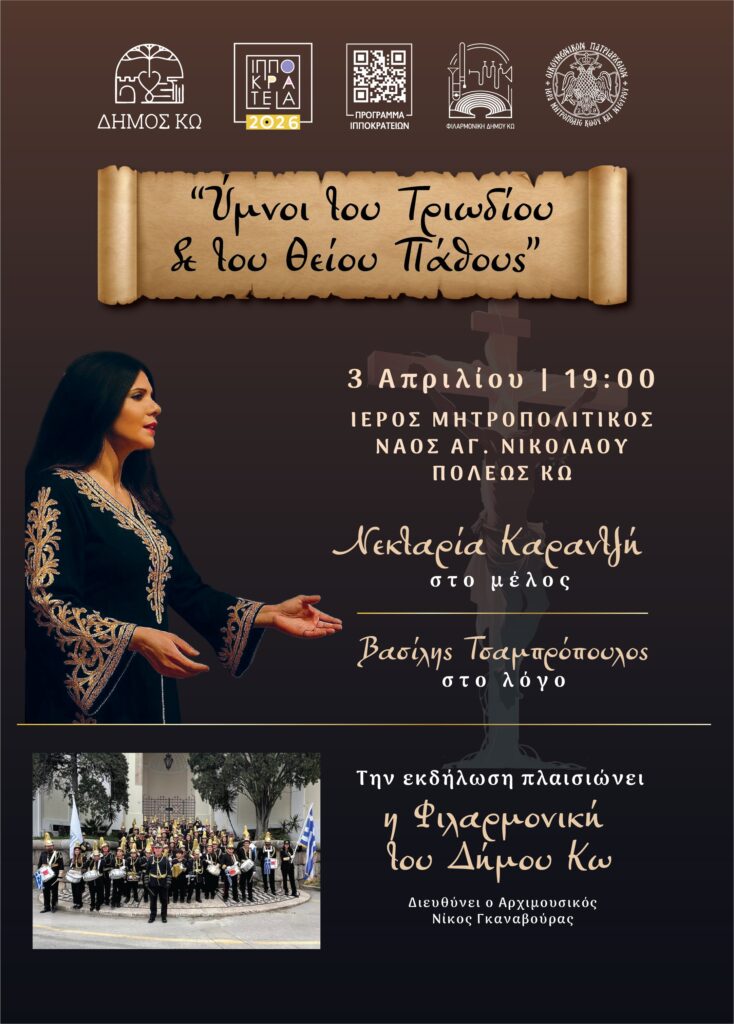 «ΥΜΝΟΙ ΤΟΥ ΤΡΙΩΔΙΟΥ ΚΑΙ ΤΟΥ ΘΕΙΟΥ ΠΑΘΟΥΣ» την Παρασκευή 3 Απριλίου στον Ιερό Ναό Αγίου Νικολάου Κω Στο πλαίσιο των Χειμερινών πολιτιστικών εκδηλώσεων «Ιπποκράτεια 2026» το Τμήμα Πολιτισμού Δήμου Κω σας ενημερώνει για τις προσεχείς εκδηλώσεις: · ΠΑΡΑΣΚΕΥΗ 03/04/26 «ΥΜΝΟΙ ΤΟΥ ΤΡΙΩΔΙΟΥ ΚΑΙ ΤΟΥ ΘΕΙΟΥ ΠΑΘΟΥΣ» στον ΙΕΡΟ ΜΗΤΡΟΠΟΛΙΤΙΚΟ ΝΑΟ ΑΓΙΟΥ ΝΙΚΟΛΑΟΥ ΠΟΛΕΩΣ ΚΩ, ΩΡΑ […]