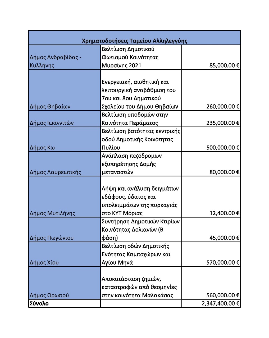 Κατόπιν πρόσκλησης του Υπουργείου Μετανάστευσης και Ασύλου, οι δήμοι Ανδραβίδας-Κυλλήνης, Θηβαίων, Ιωαννιτών, Κω, Λαυρεωτικής, Μυτιλήνης, Πωγωνίου, Ωρωπού και Χίου, επιδοτούνται με 2.347.400 ευρώ συνολικά, για δημοτικά έργα, μετά από προτάσεις που κατέθεσαν, κατά την κρίση τους και βάσει των τοπικών αναγκών.