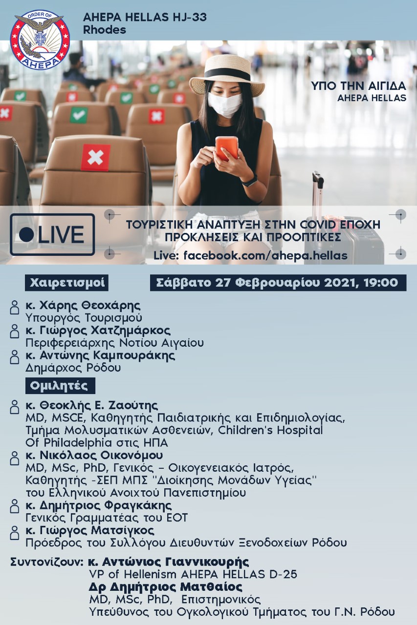 Το νέο τοπίο που διαμορφώνεται στον τομέα του τουρισμού και οι συνθήκες που καλείται να αντιμετωπίσει ο κλάδος βρίσκονται στο επίκεντρο της διαδικτυακής εκδήλωσης που οργανώνει το Τμήμα AHEPA HJ-33 Rhodes, υπό την αιγίδα της AHEPA HELLAS DISTRICT 25, το Σάββατο 27 Φεβρουαρίου 2021, 19:00 ώρα Ελλάδος.