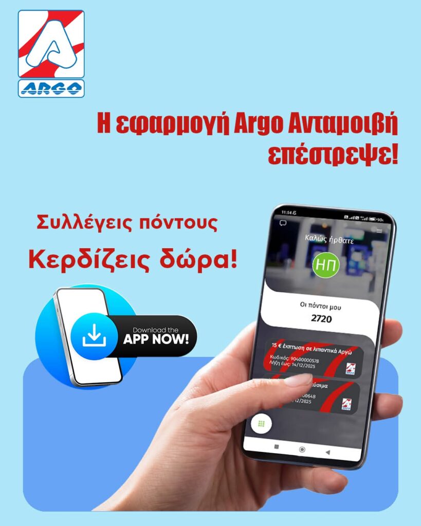 🚀 Η εφαρμογή ARGO Ανταμοιβή είναι ξανά μαζί σας! Κερδίστε πόντους σε καύσιμα, λιπαντικά & πλυντήριο, εξαργυρώστε τους σε δωροεπιταγές και απολαύστε αποκλειστικές προσφορές! 🎁✨