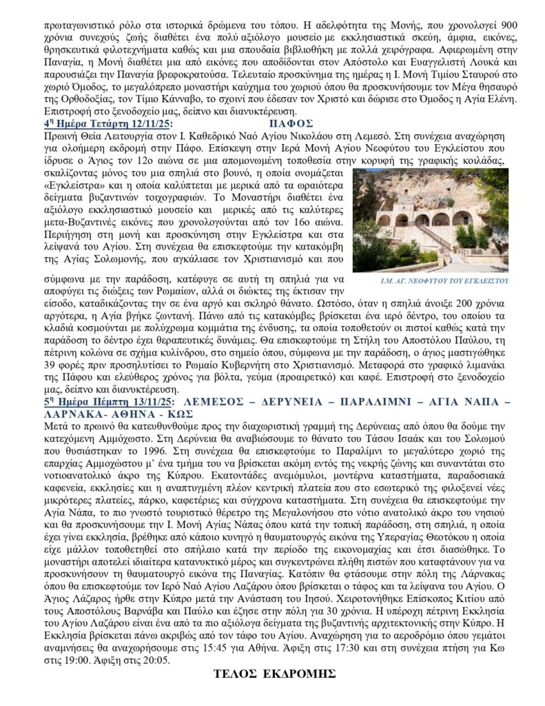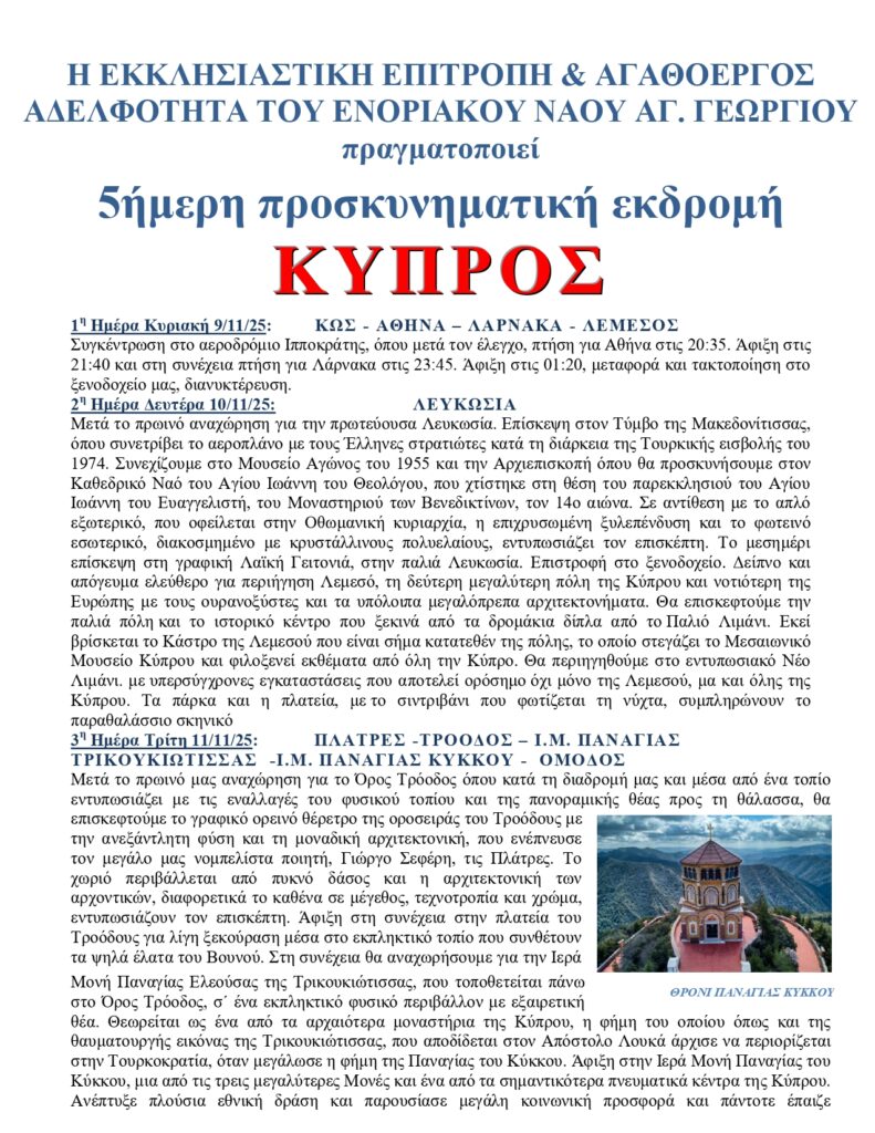 Η Εκκλησιαστική Επιτροπή και η Αγαθοεργός Αδελφότητα του Ιερού Ναού Αγίου Γεωργίου Πυλίου διοργανώνουν προσκυνηματική εκδρομή στην Κύπρο, 9 έως 13 Νοεμβρίου.