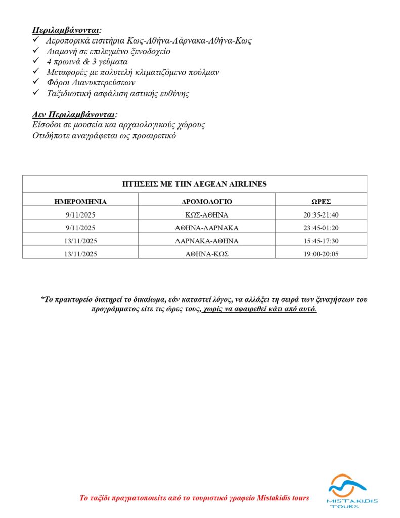 Η εκδρομή περιλαμβάνει διαμονή σε ξενοδοχείο 4 αστέρων στη Λεμεσό, γεύματα και πολυτελείς μετακινήσεις.