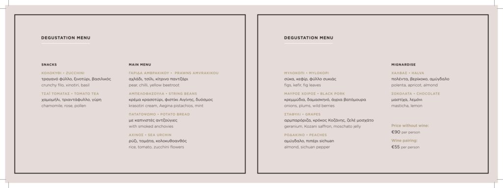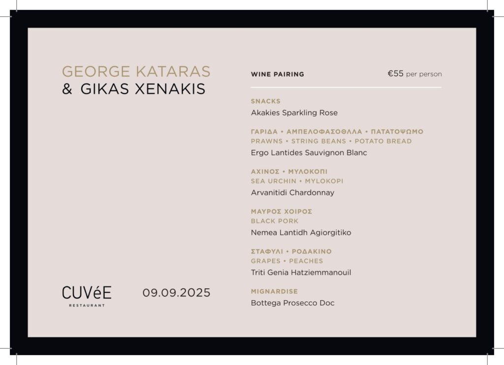 Για αυτή τη μοναδική βραδιά, οι δύο σεφ υπογράφουν ένα degustation menu, με δυνατότητα wine pairing, για μία εμπειρία που θα μείνει αξέχαστη.
