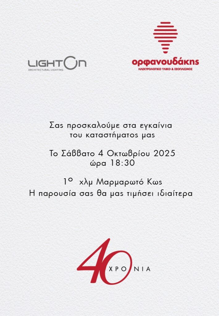 Η εταιρεία Ορφανουδάκης Ηλεκτρολογικό Υλικό & Εξοπλισμός γιορτάζει φέτος τα 40 χρόνια παρουσίας της και εγκαινιάζει το νέο της κατάστημα στην Κω με την LightOn Architectural Lighting.