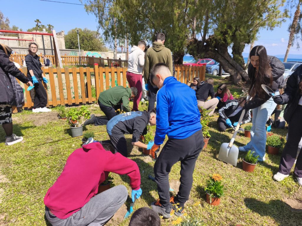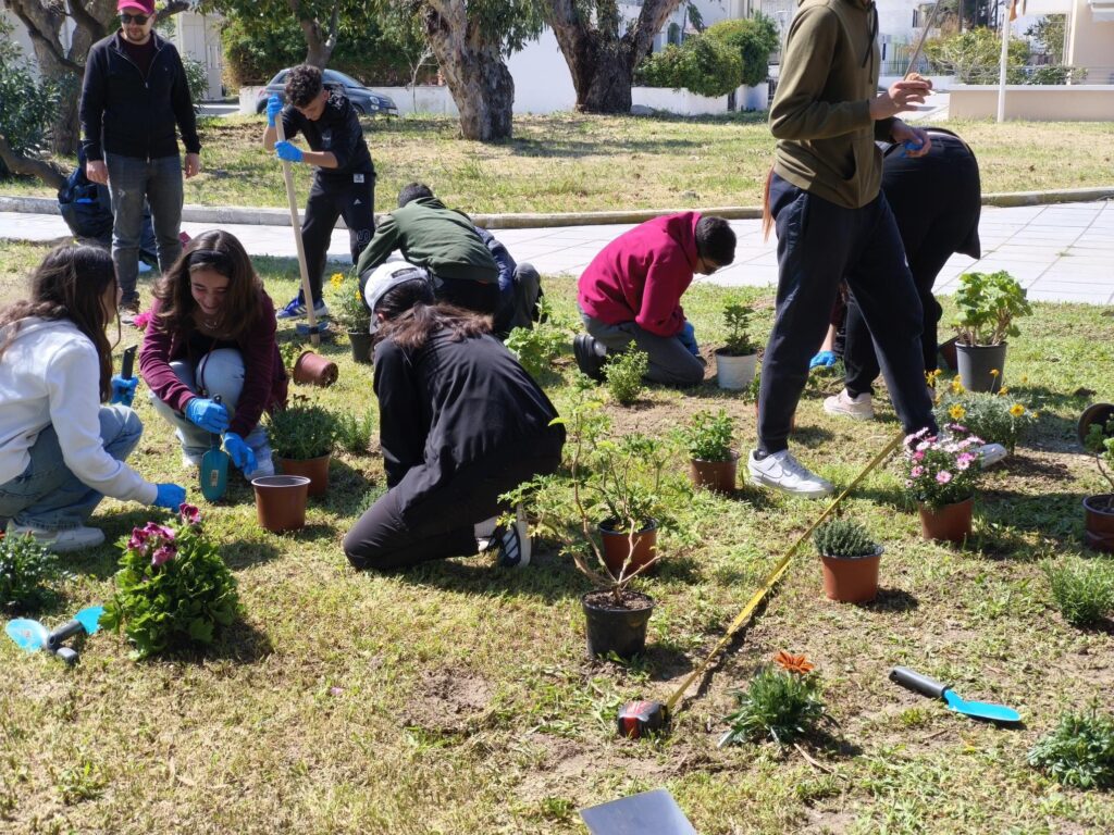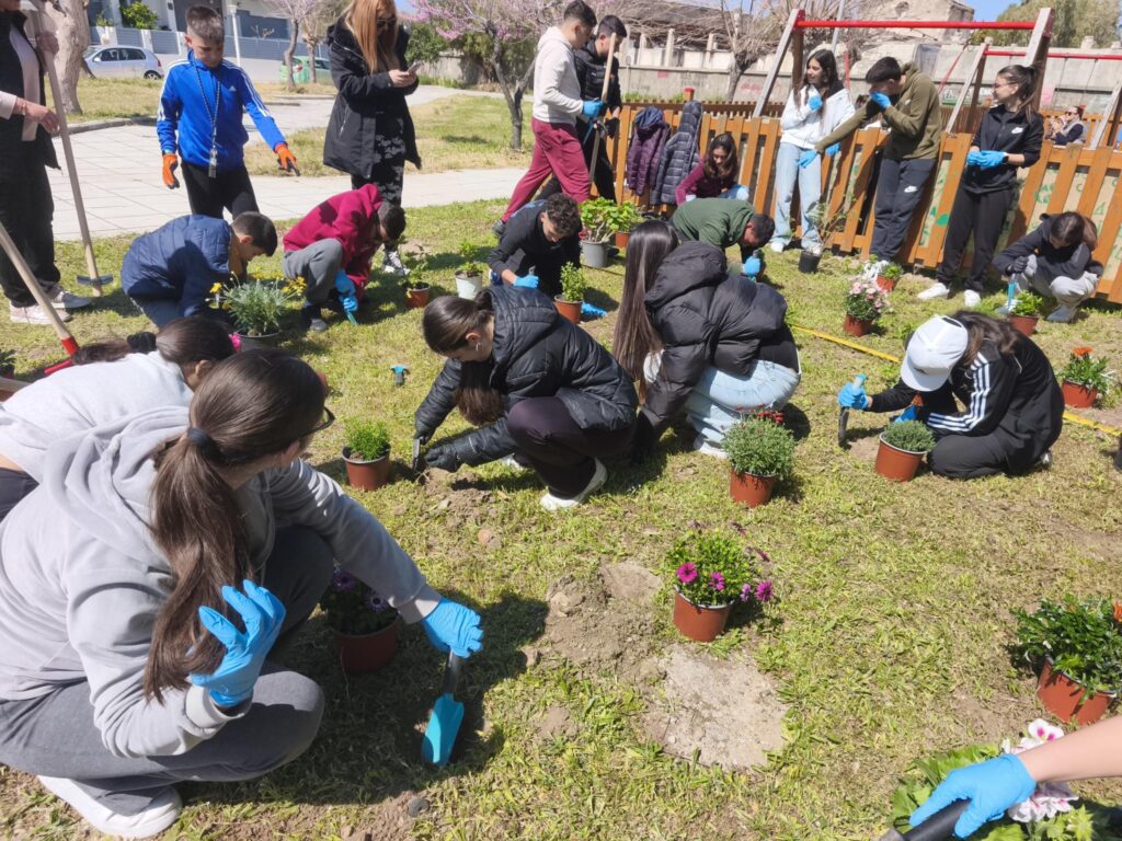 Δεκάδες μαθητές, συνοδευόμενοι από τους καθηγητές τους, αντάλλαξαν τις σχολικές τσάντες με γάντια και εργαλεία κηπουρικής. Με κέφι και μεράκι, τα παιδιά φύτεψαν καλλωπιστικά φυτά , πολύχρωμα λουλούδια και δεντράκια.