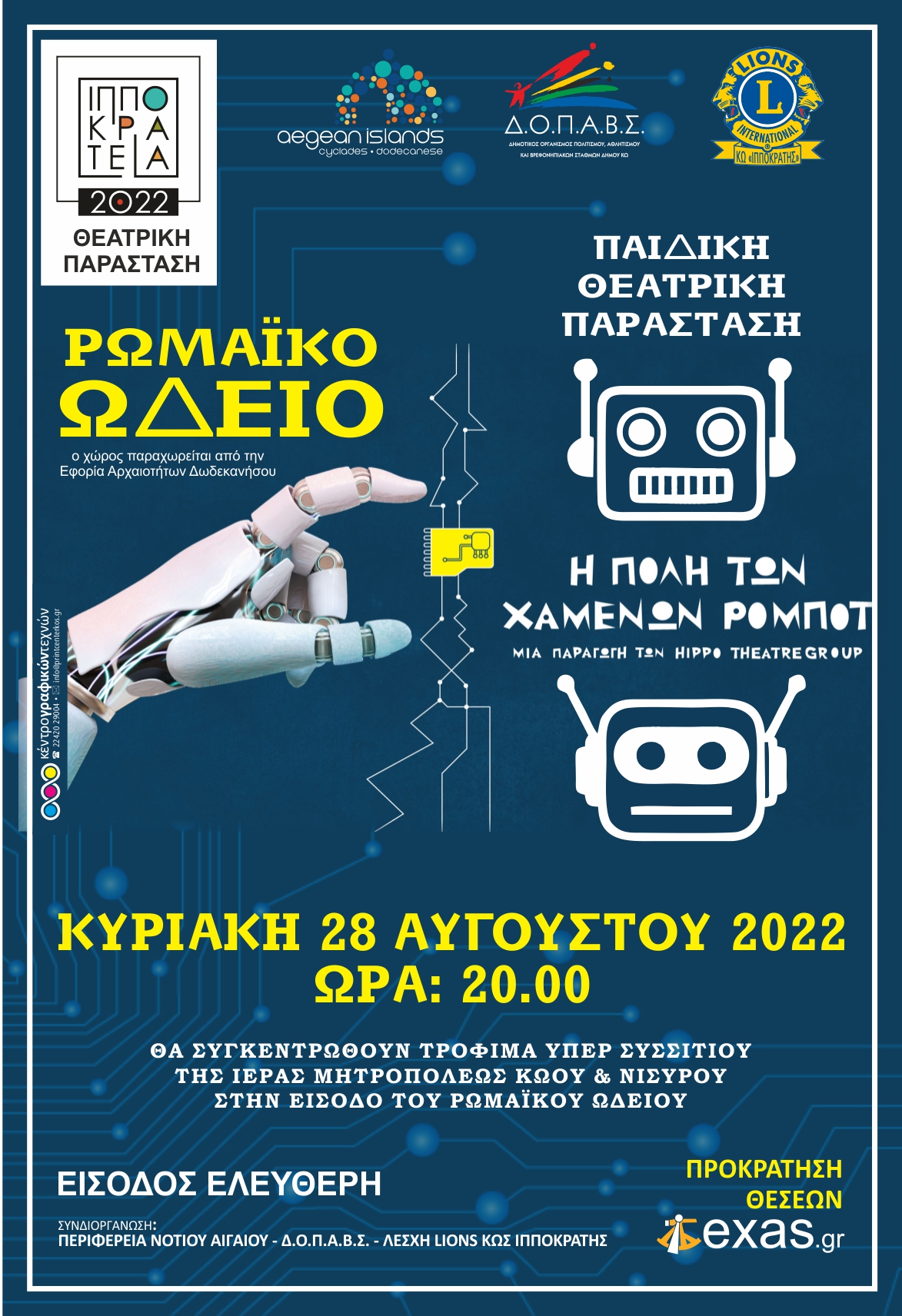 Lions Κως Ιπποκράτης: Δωρεάν παιδική παράσταση «ΠΟΛΗ ΤΩΝ ΧΑΜΕΝΩΝ ΡΟΜΠΟΤ» στο Ρωμαϊκό Ωδείο την Κυριακή 28 Αυγούστου – Προκράτηση στο Exas.gr – Συγκέντρωση τροφίμων για το συσσίτιο