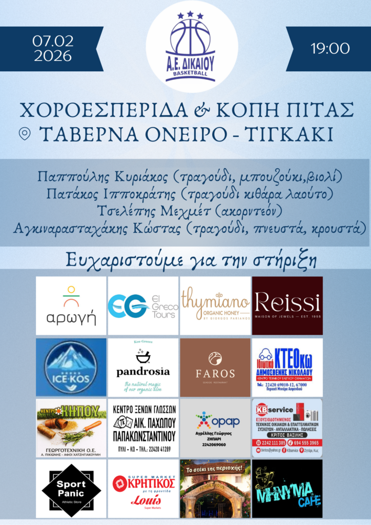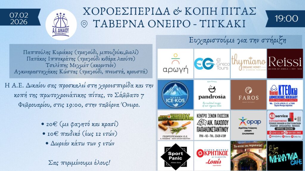 Η Α.Ε. Δικαίου σας προσκαλεί στη χοροεσπερίδα και κοπή της πρωτοχρονιάτικης πίτας, το Σάββατο 7 Φεβρουαρίου, στις 19:00, στην ταβέρνα Όνειρο.